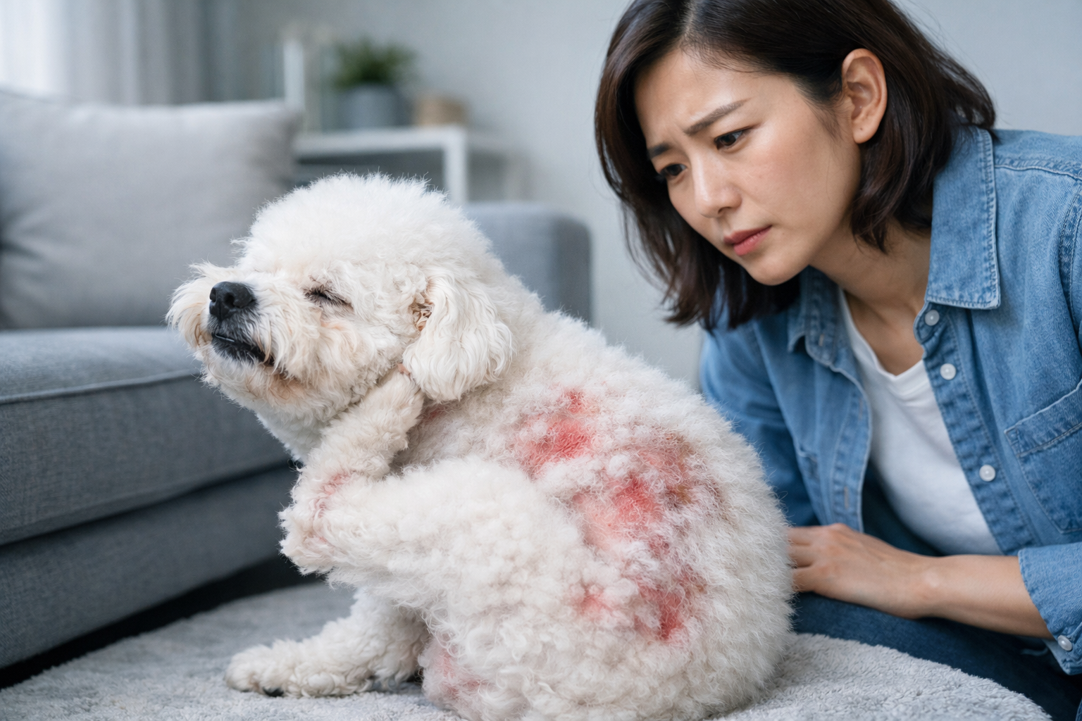 ⚠️ 코코는 극심한 가려움증으로 밤낮없이 몸을 긁었습니다. 이로 인해 피부가 붉게 변하고, 털이 심하게 빠지기까지 했습니다. 보호자님은 코코가 계속 긁다가 피부에 더 큰 문제가 생길까 봐 늘 노심초사했습니다.